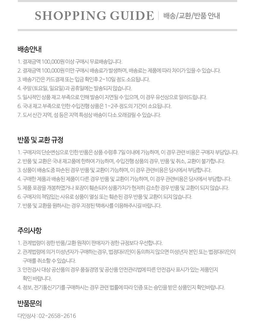- 배송비 : 기본배송료는 3000원 입니다. (도서,산간,오지 일부지역은 배송비가 추가될 수 있습니다) 100,000원 이상 구매시 무료배송입니다.